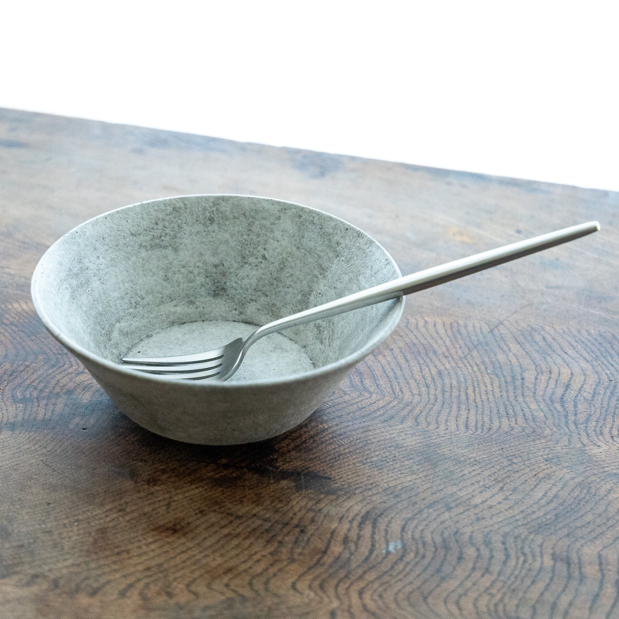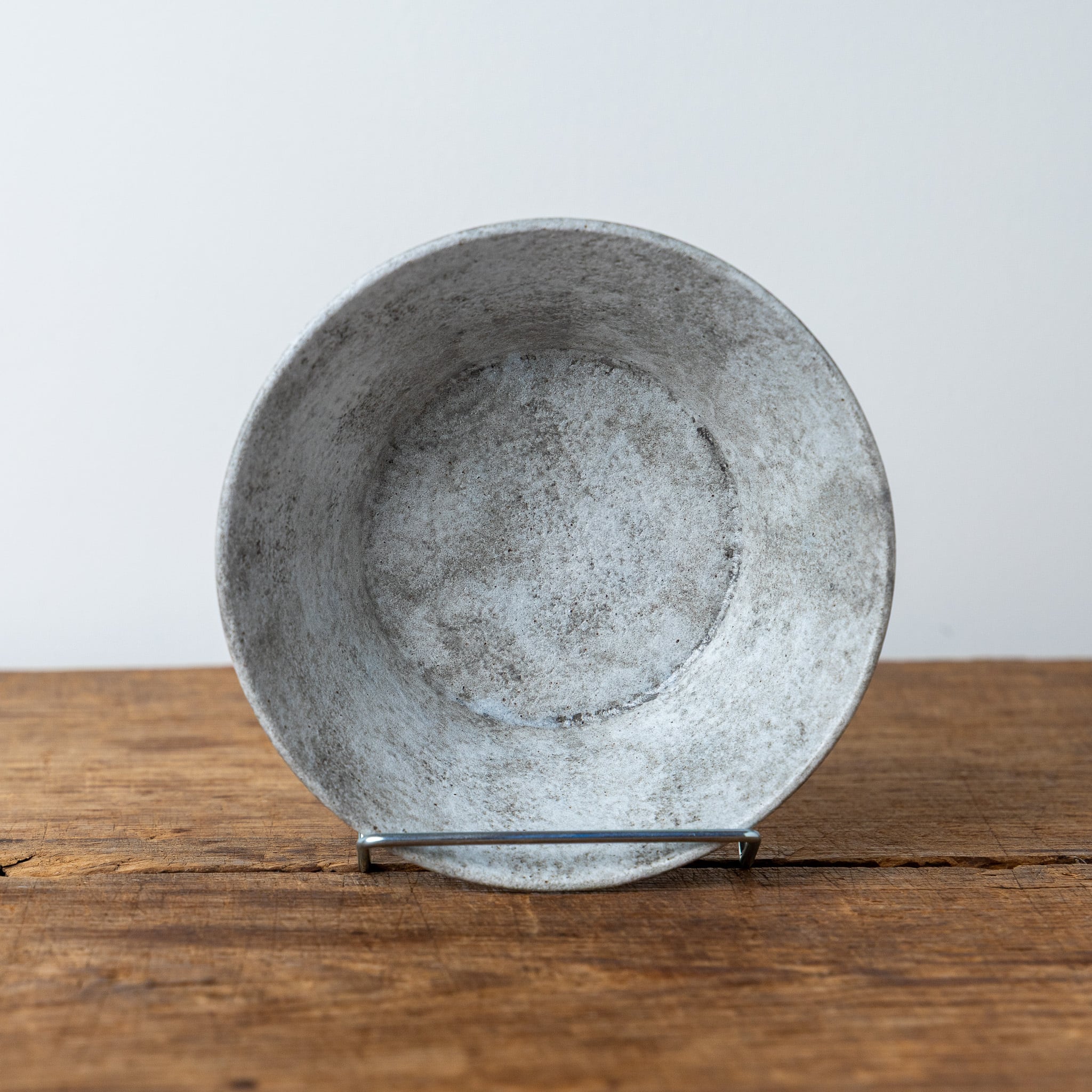 黒土に薄く灰釉をかけ、その上から青と白の2種類の釉薬を手でテクスチャーをつけながら塗りっています。発掘された器のような特徴的な色合いやテクスチャーにしました。