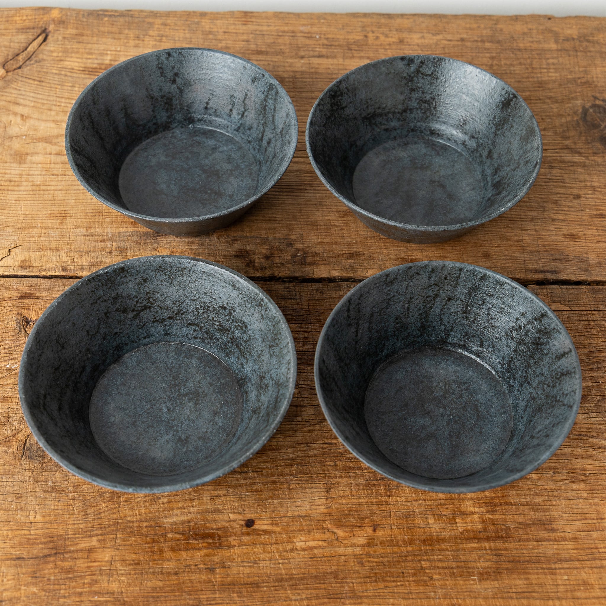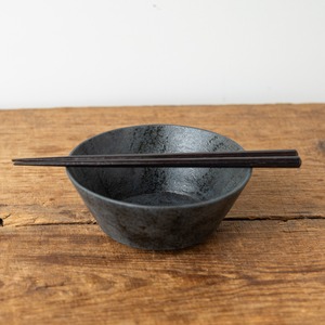 黒土に薄く灰釉をかけ、その上から黒と白の2種類の釉薬を手でテクスチャーをつけながら塗り、グレーから黒い色のうつわを作りました。