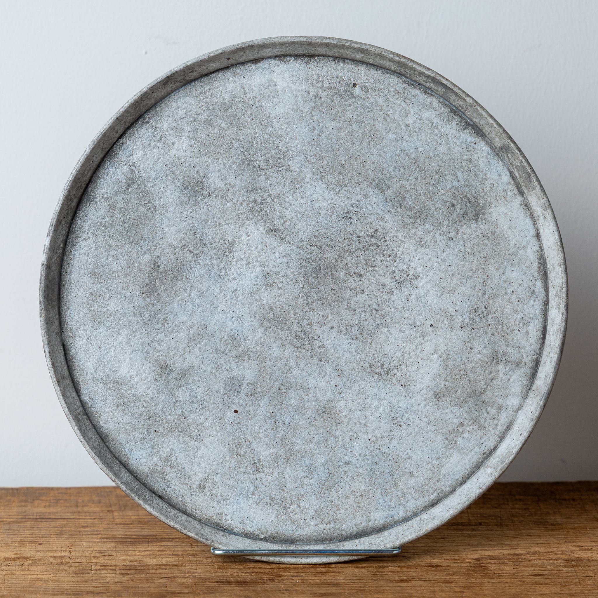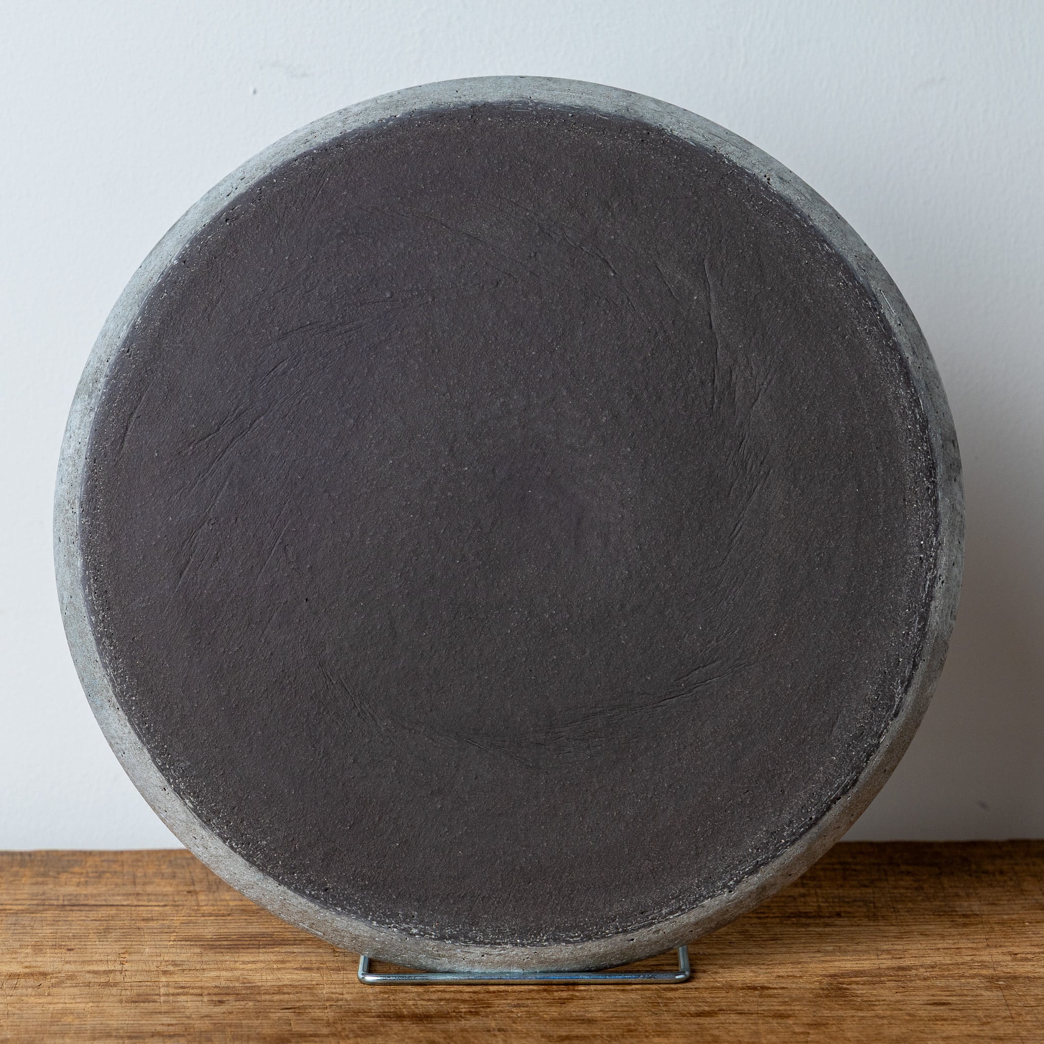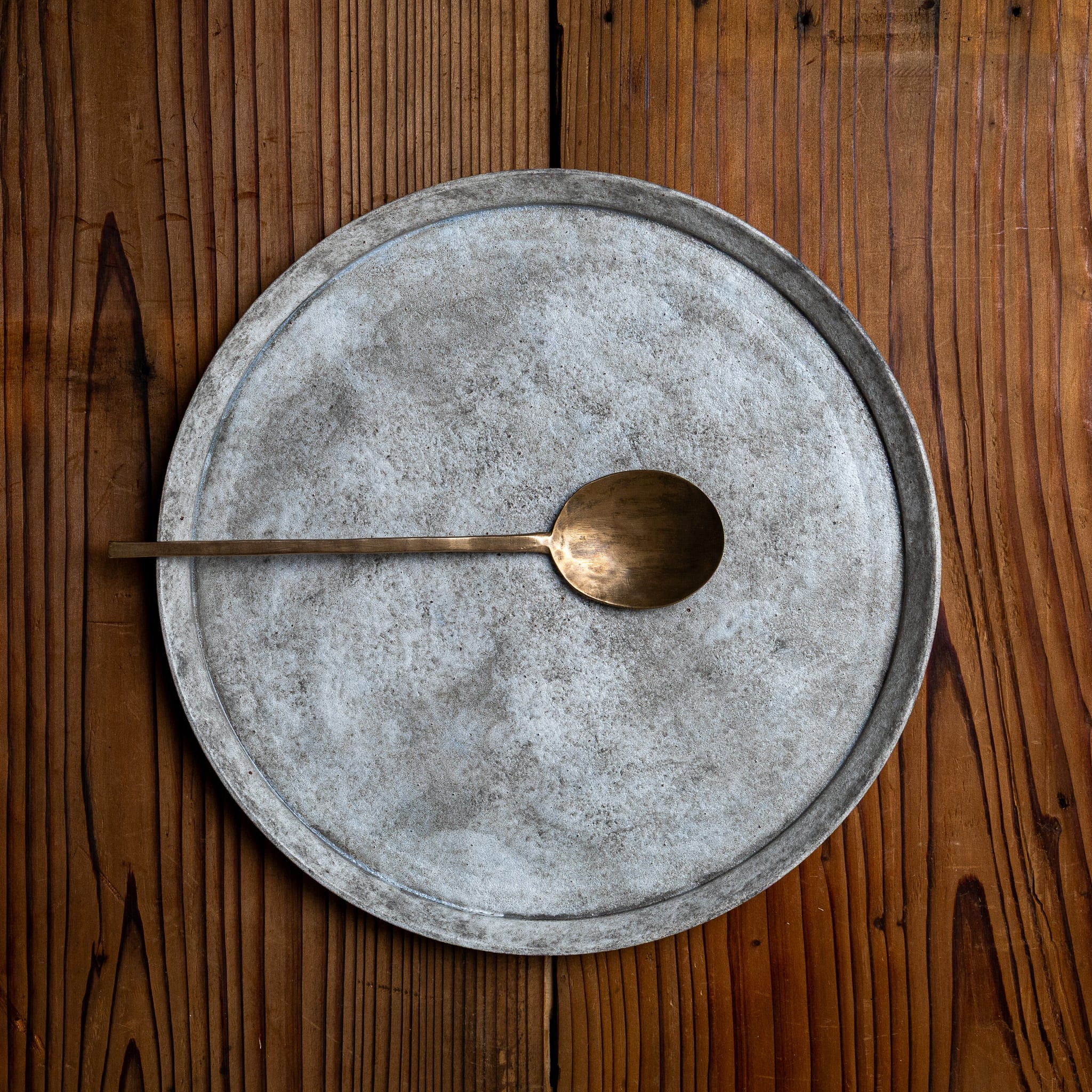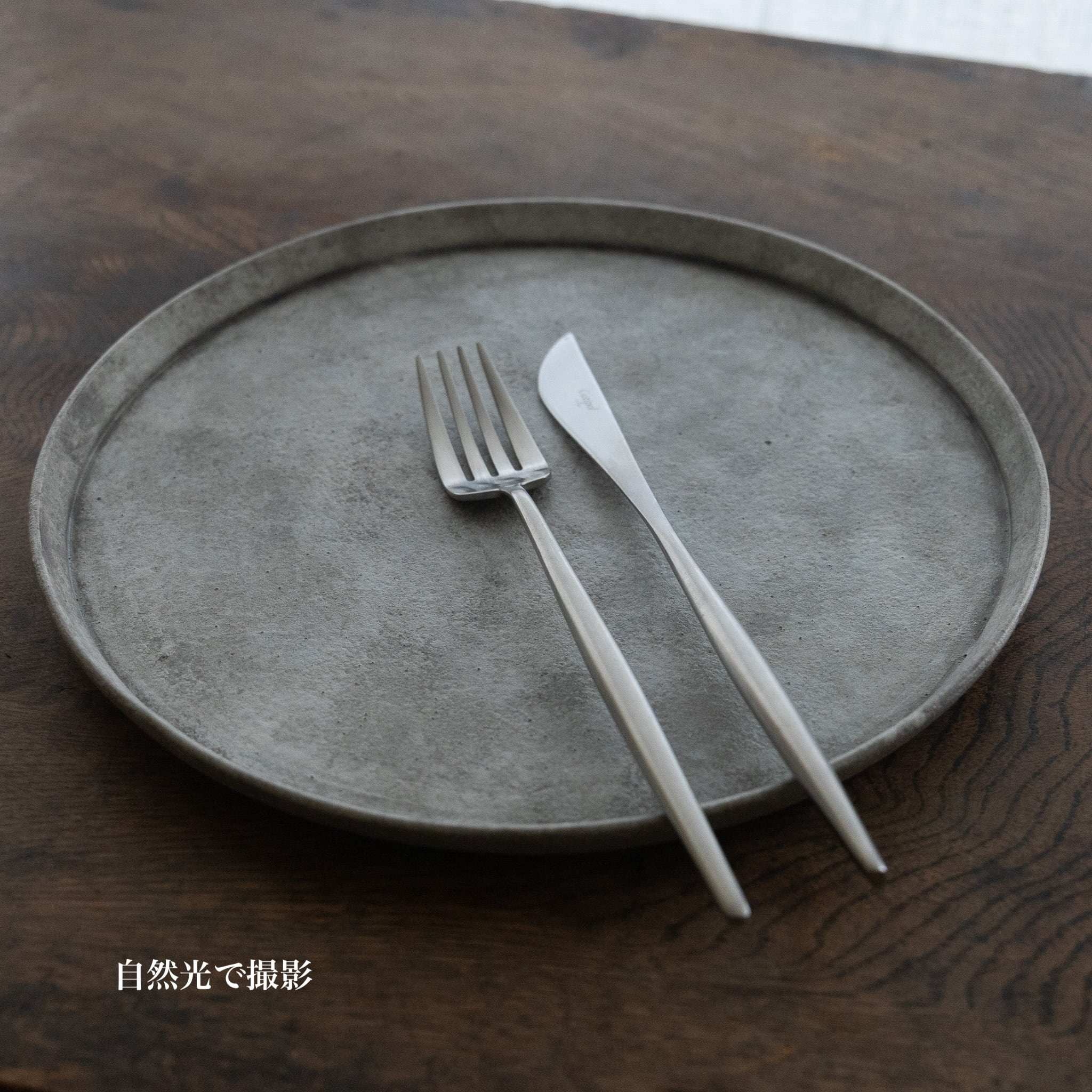 黒土に薄く灰釉をかけ、その上から青と白の2種類の釉薬を手でテクスチャーをつけながら塗りっています。発掘された器のような特徴的な色合いやテクスチャーにしました。