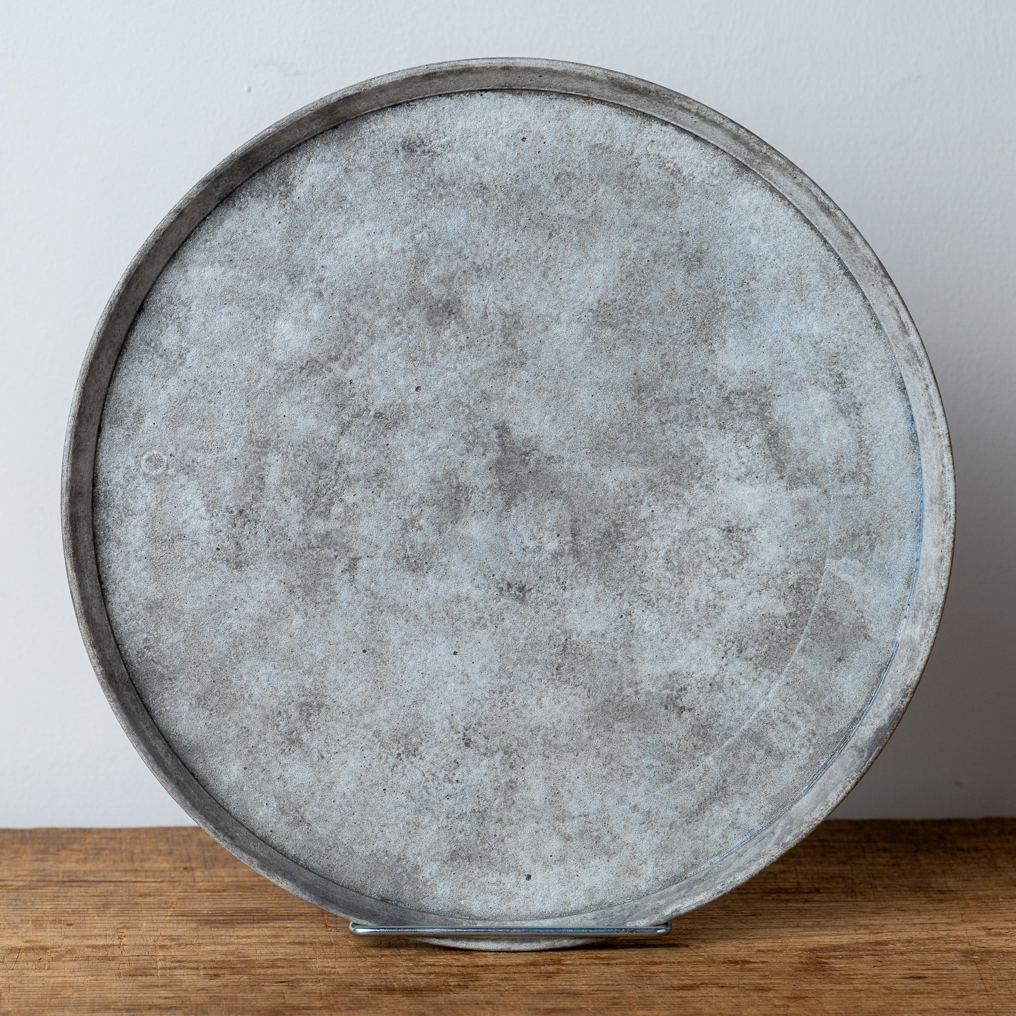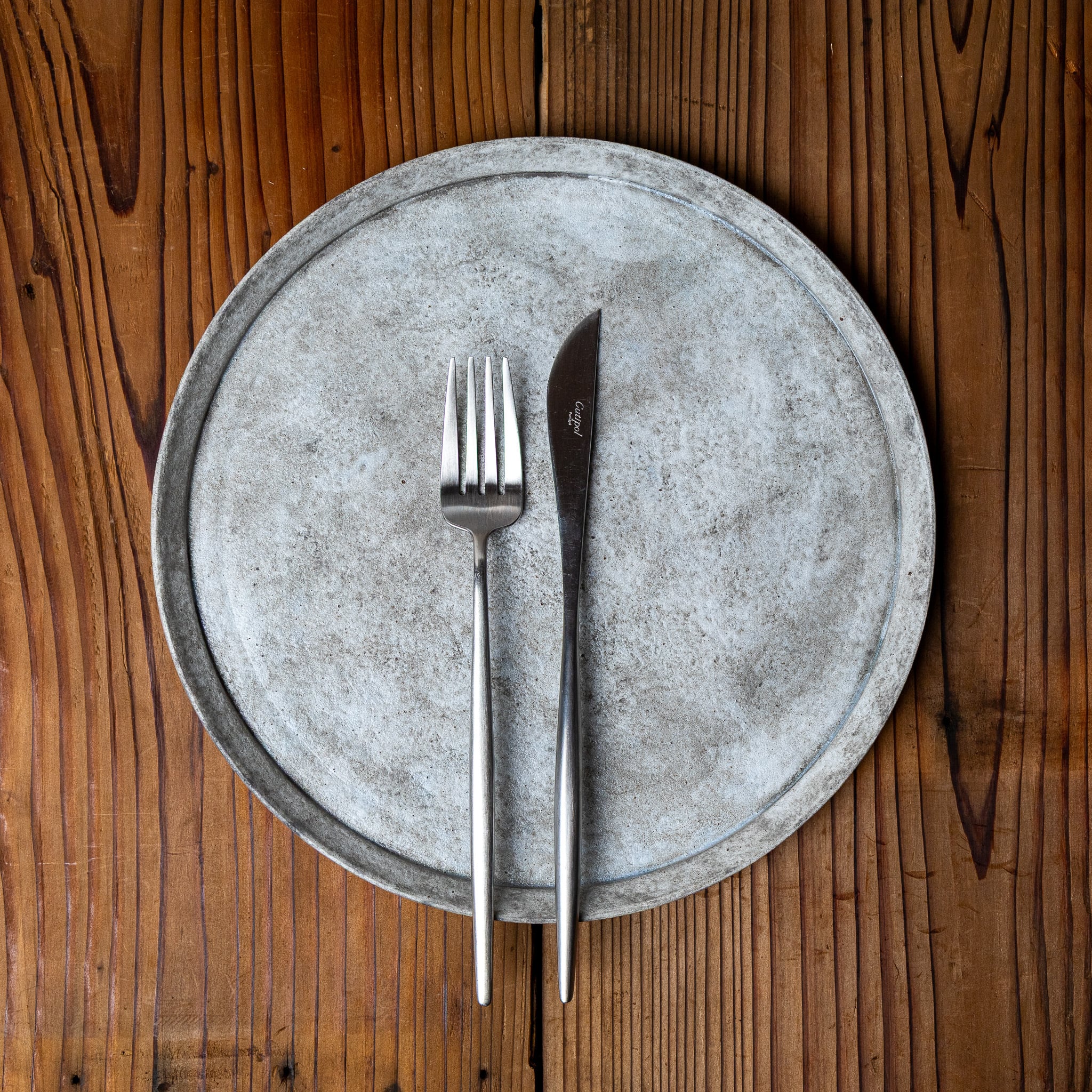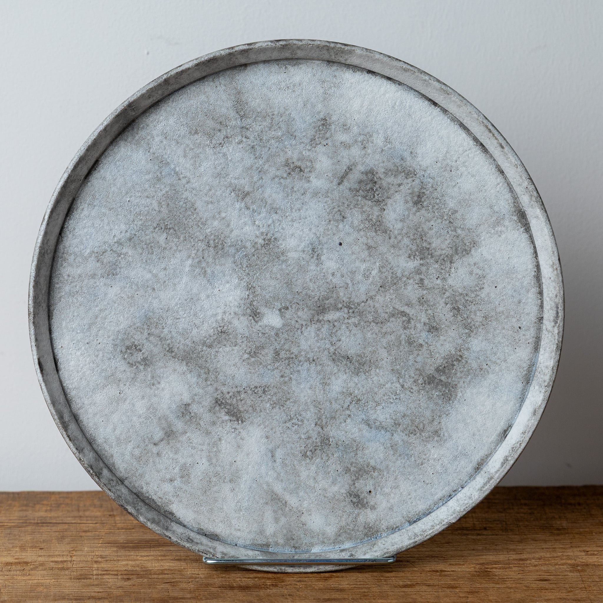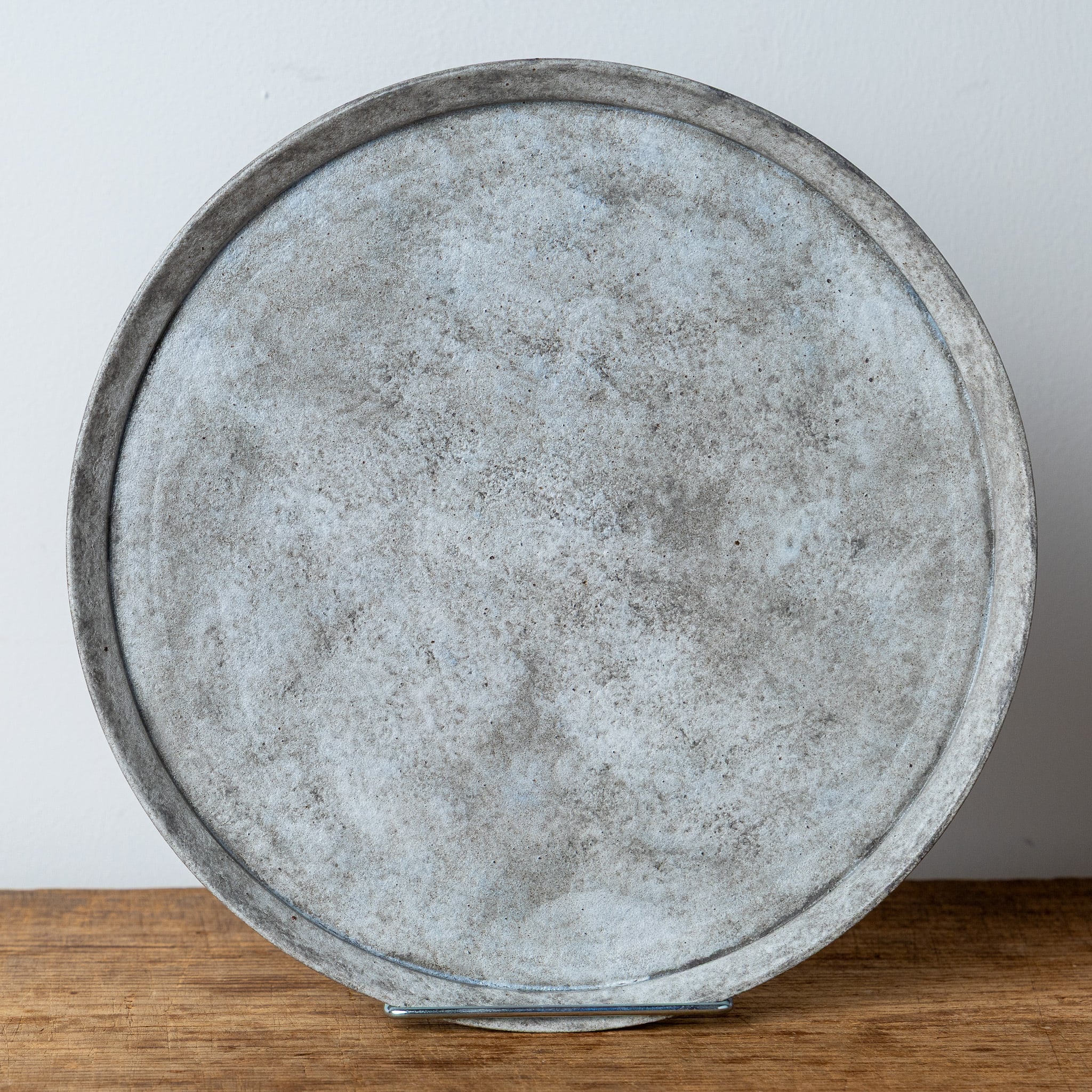 黒土に薄く灰釉をかけ、その上から青と白の2種類の釉薬を手でテクスチャーをつけながら塗りっています。発掘された器のような特徴的な色合いやテクスチャーにしました。