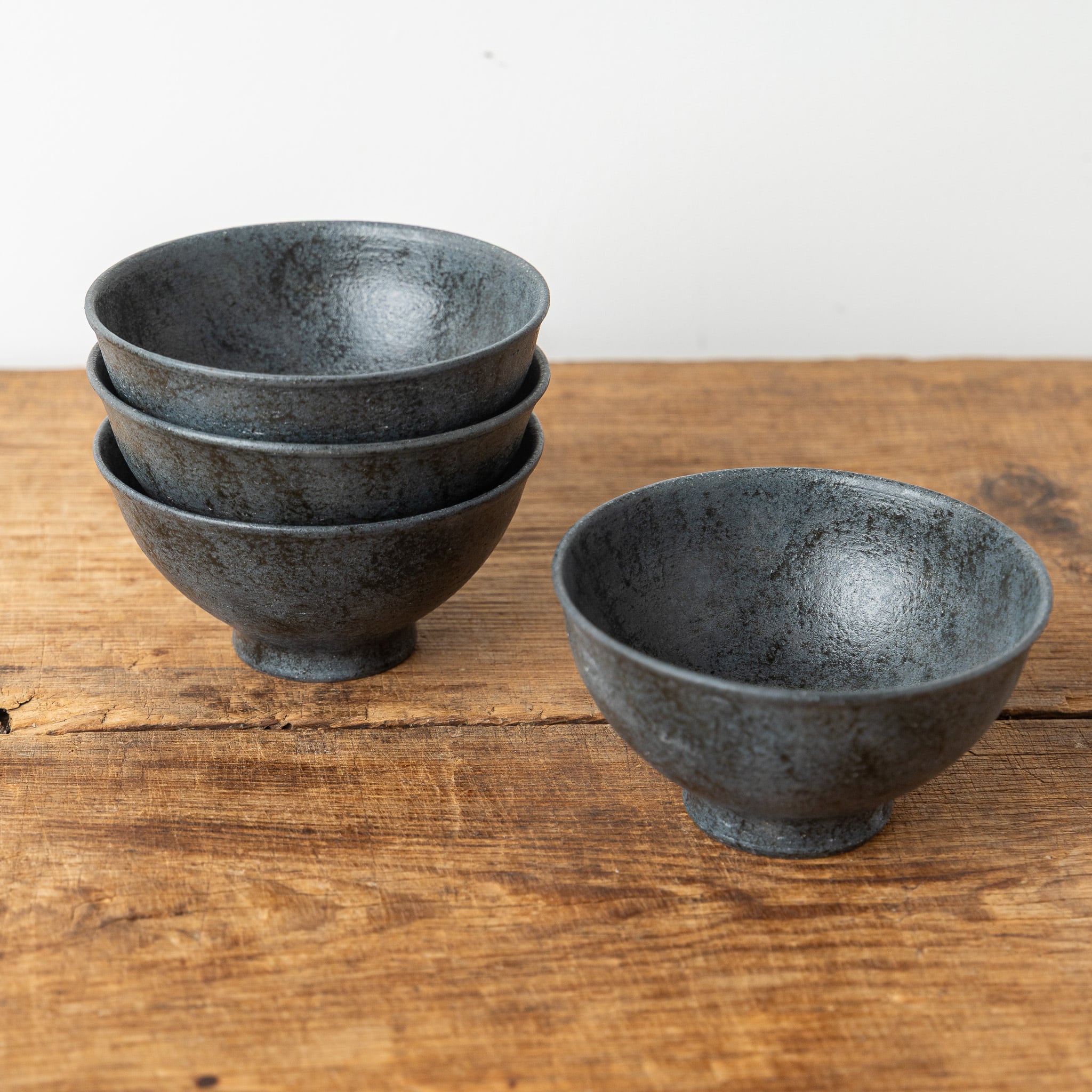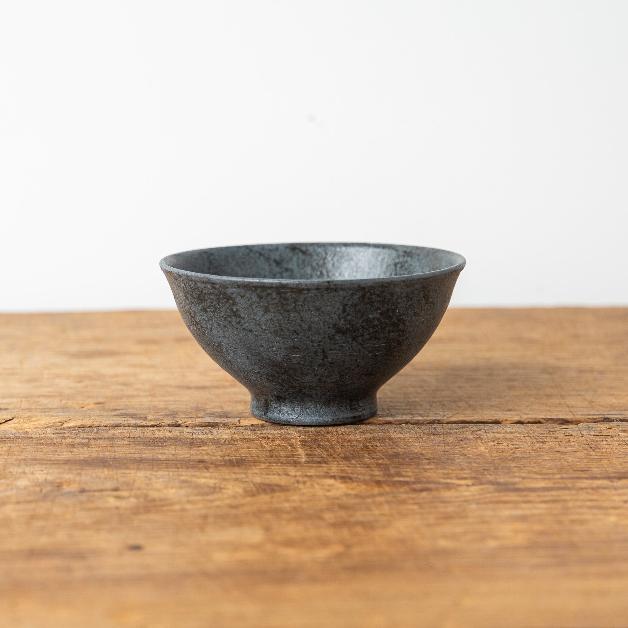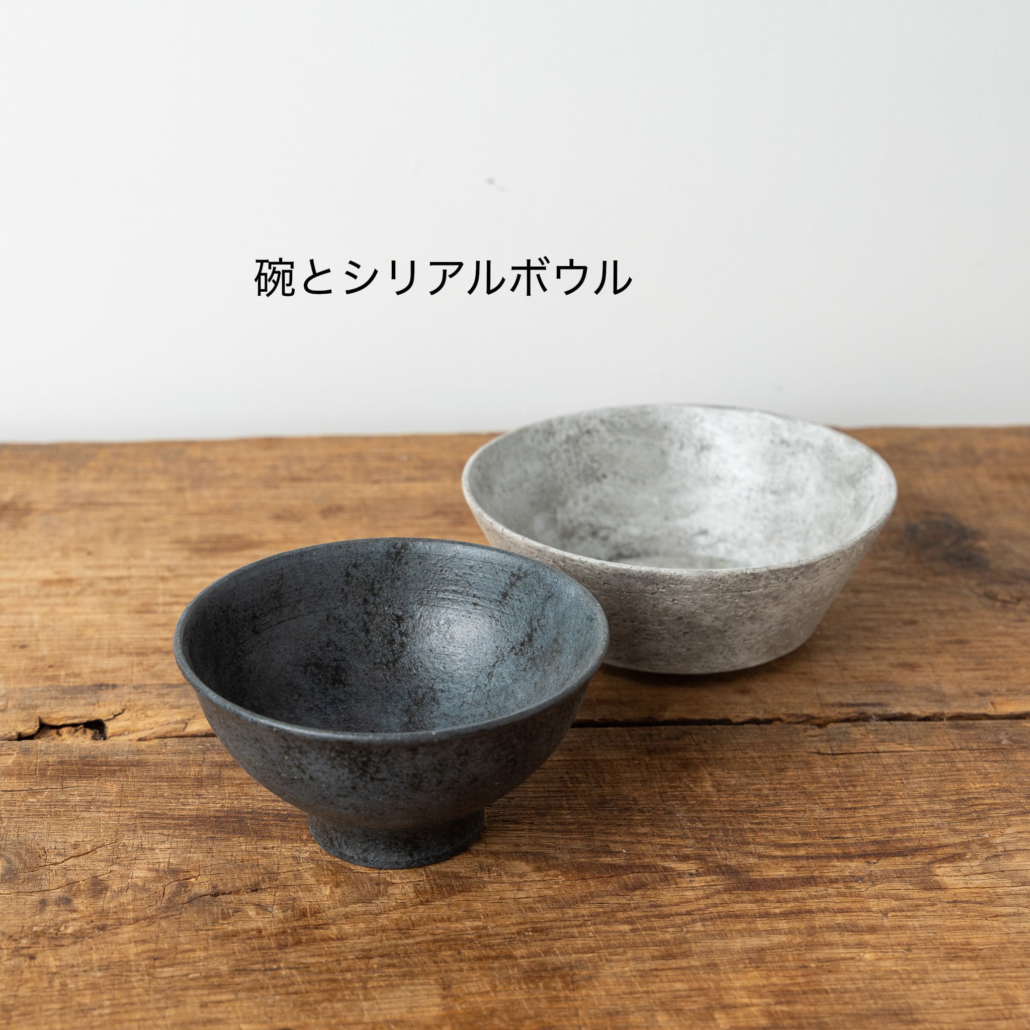 黒土に薄く灰釉をかけ、その上から黒と白の2種類の釉薬を手でテクスチャーをつけながら塗り、グレーから黒い色のうつわを作りました。