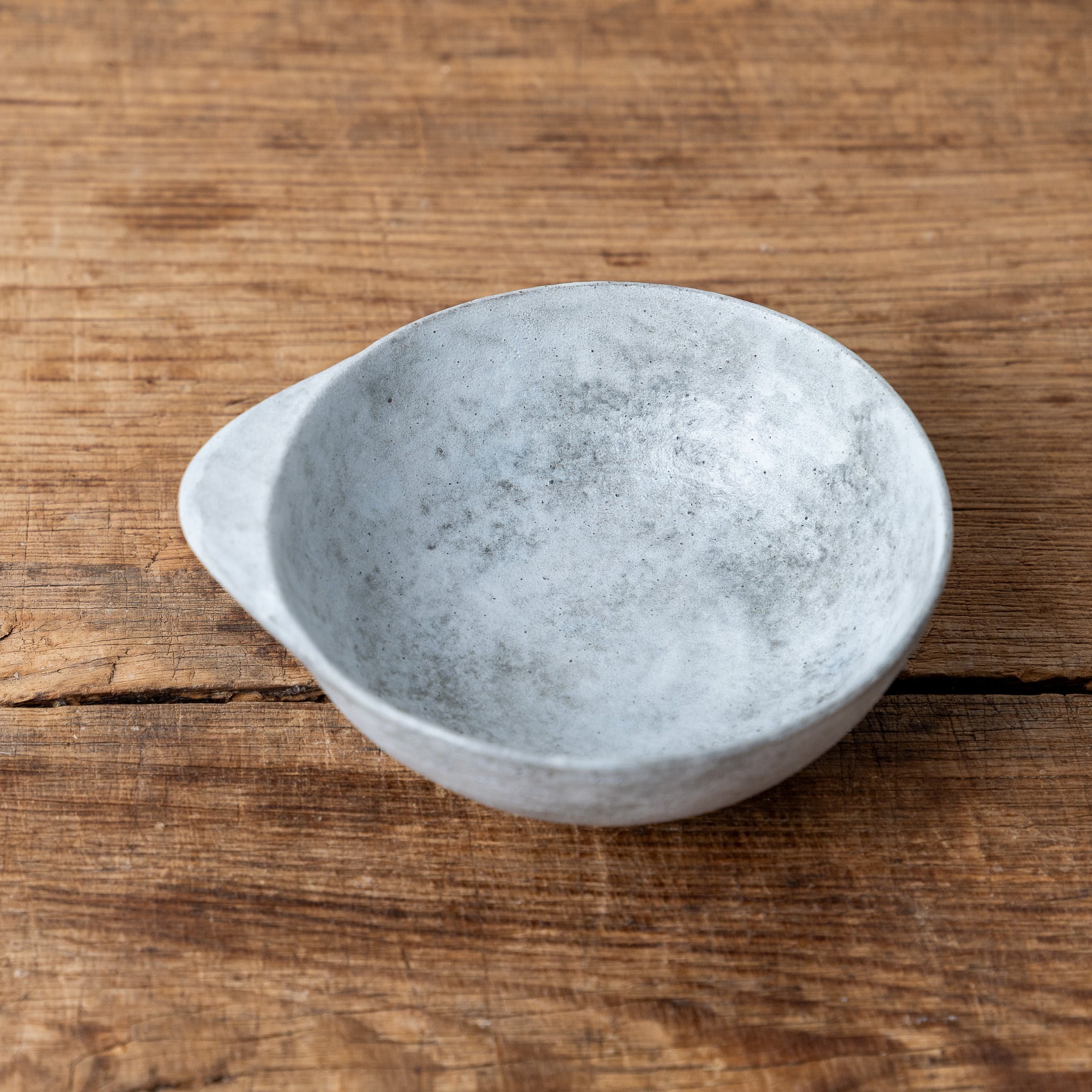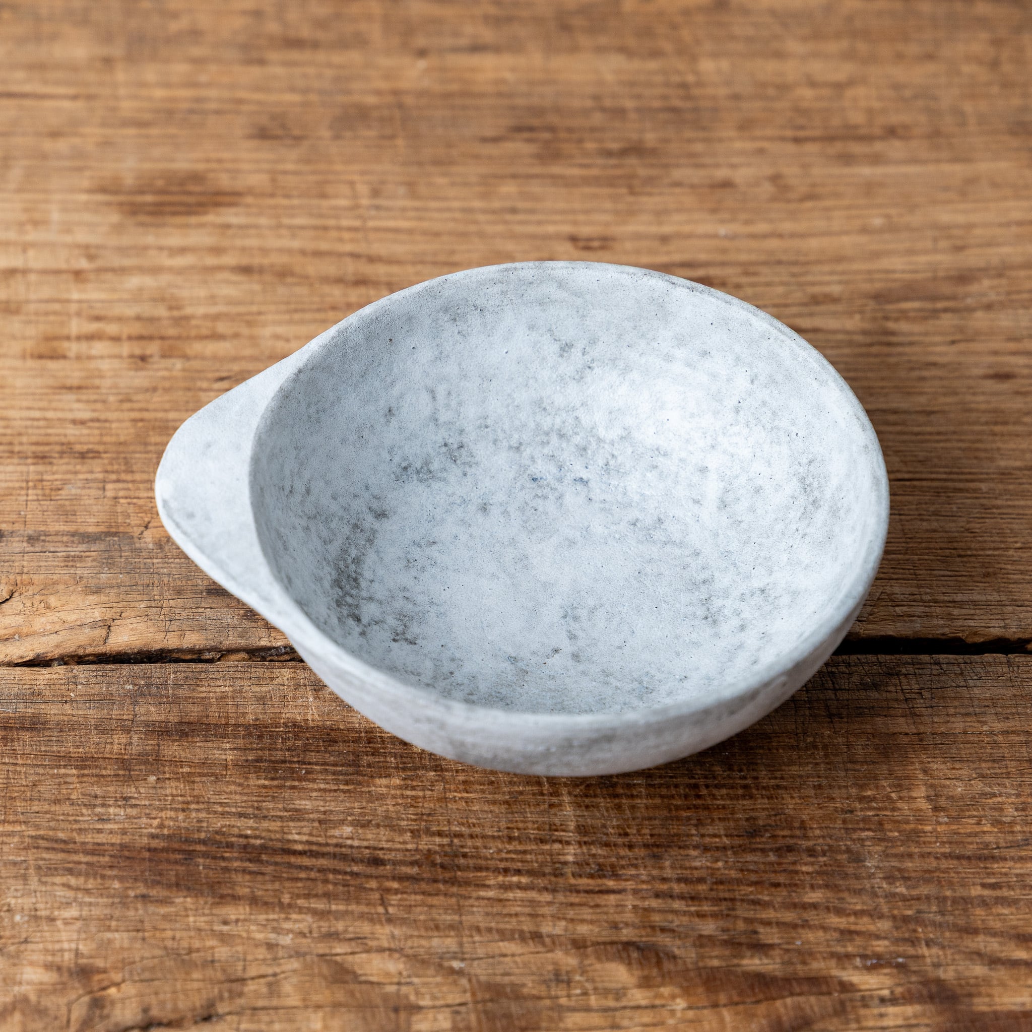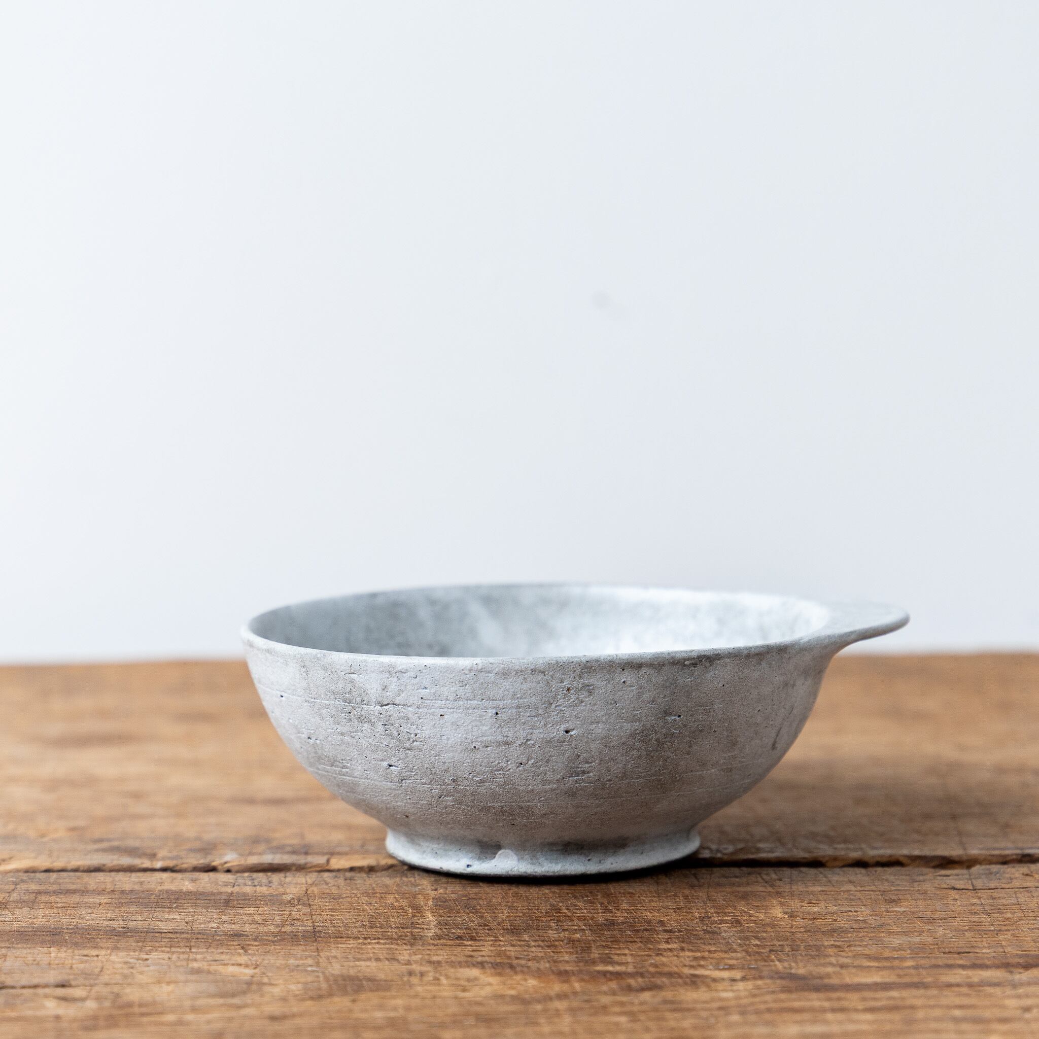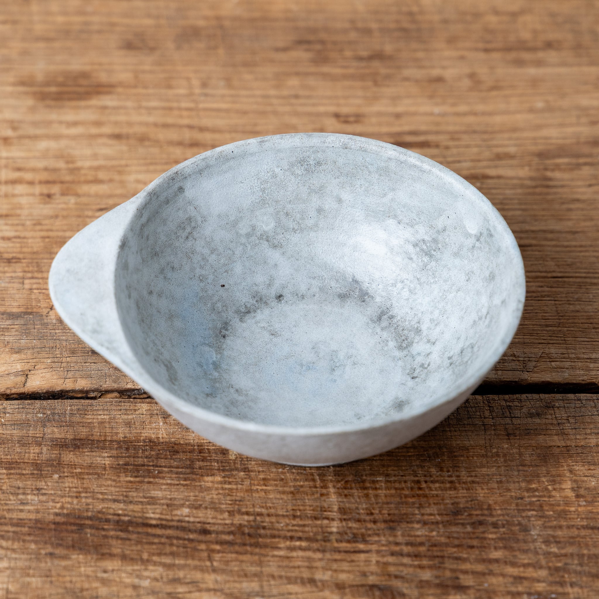 黒土に薄く灰釉を施し、さらに青と白の釉薬を手作業で重ねています。独自のテクスチャーとともに、発掘された器のような独特の風合いを表現しました。シンプルながらも存在感のあるデザインが、お料理を引き立てます。