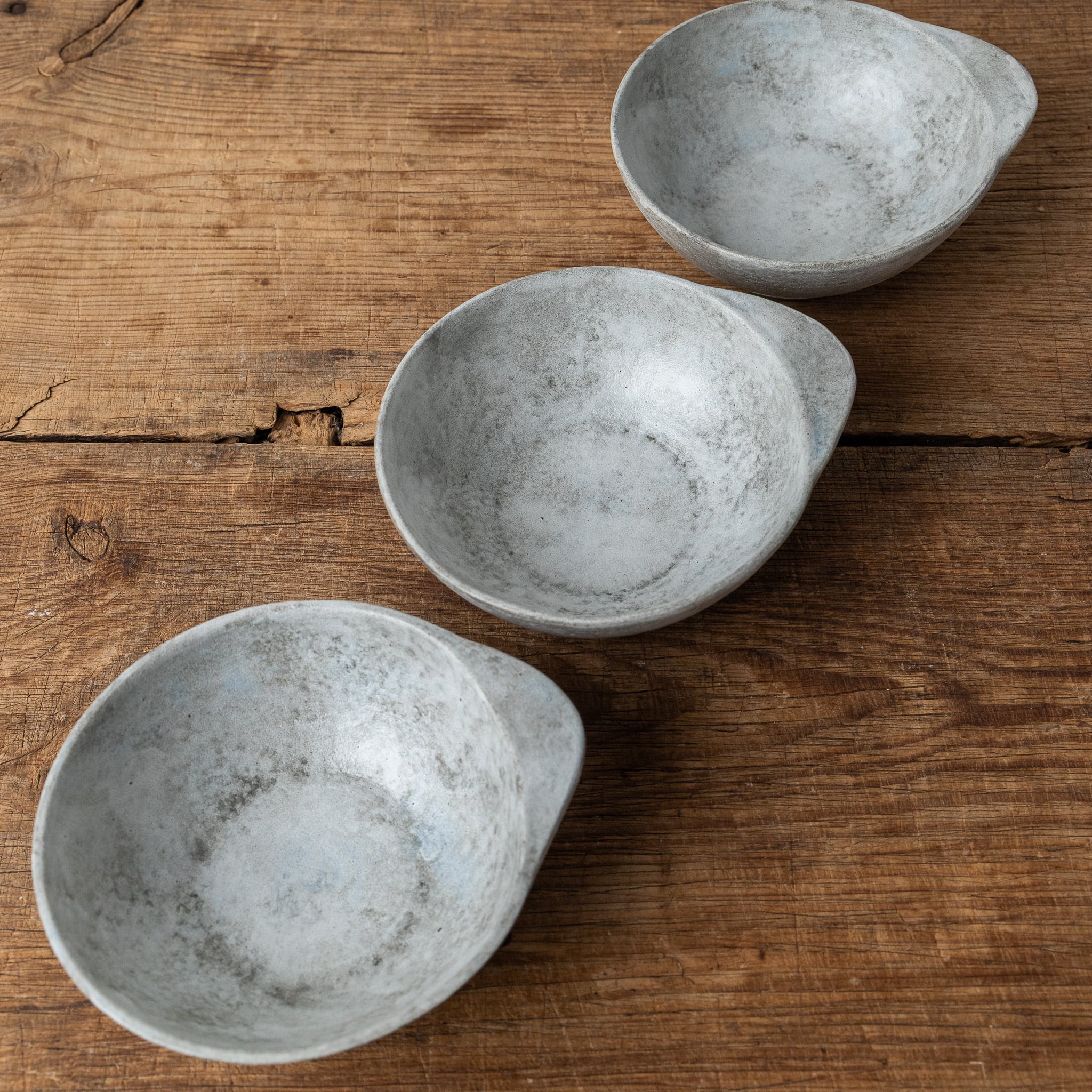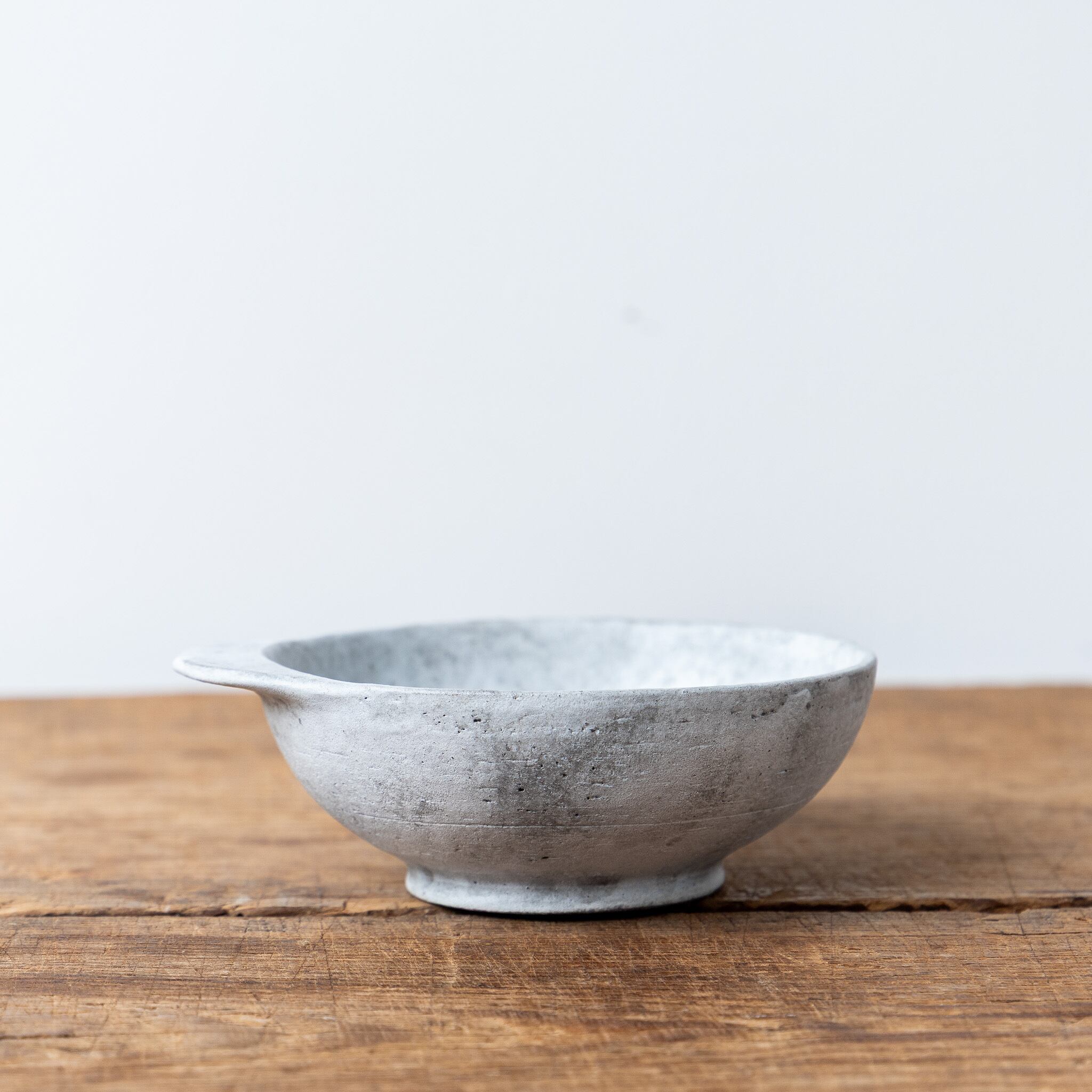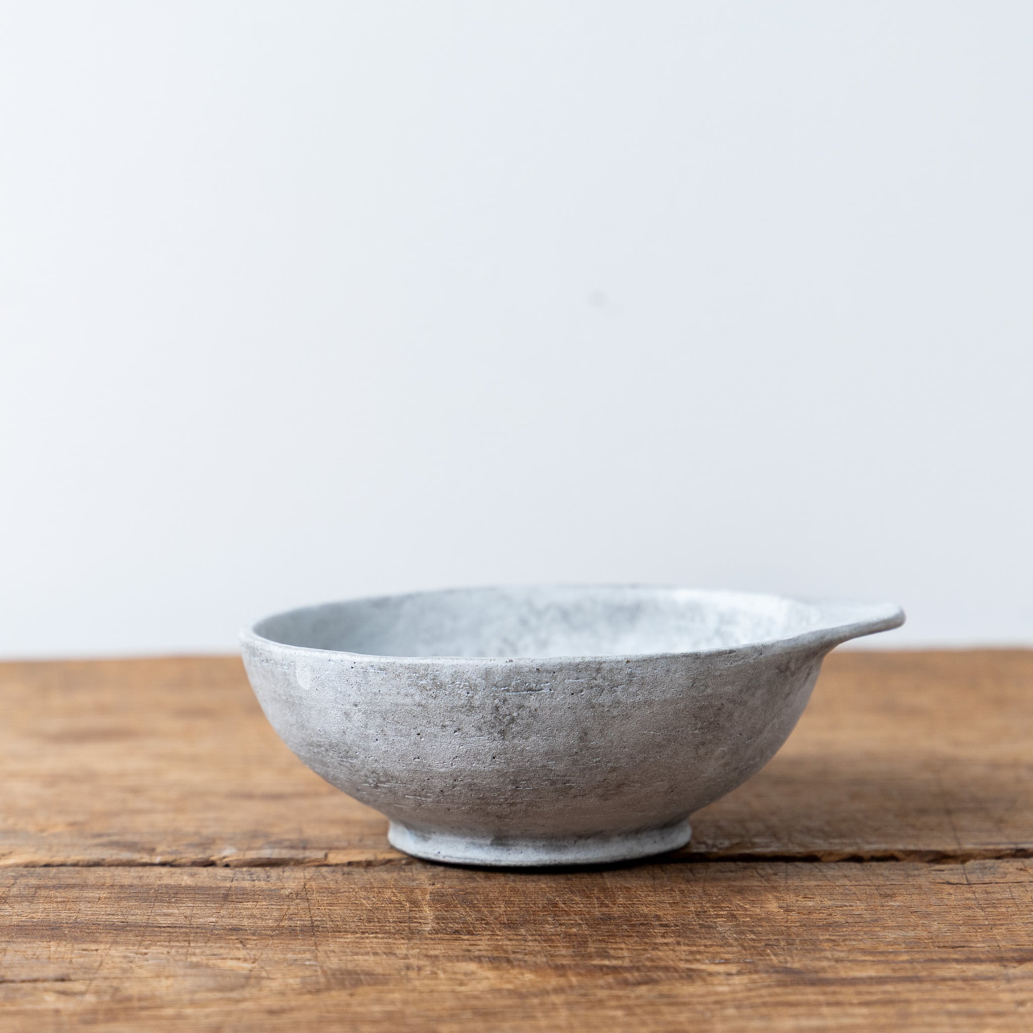 黒土に薄く灰釉を施し、さらに青と白の釉薬を手作業で重ねています。独自のテクスチャーとともに、発掘された器のような独特の風合いを表現しました。シンプルながらも存在感のあるデザインが、お料理を引き立てます。