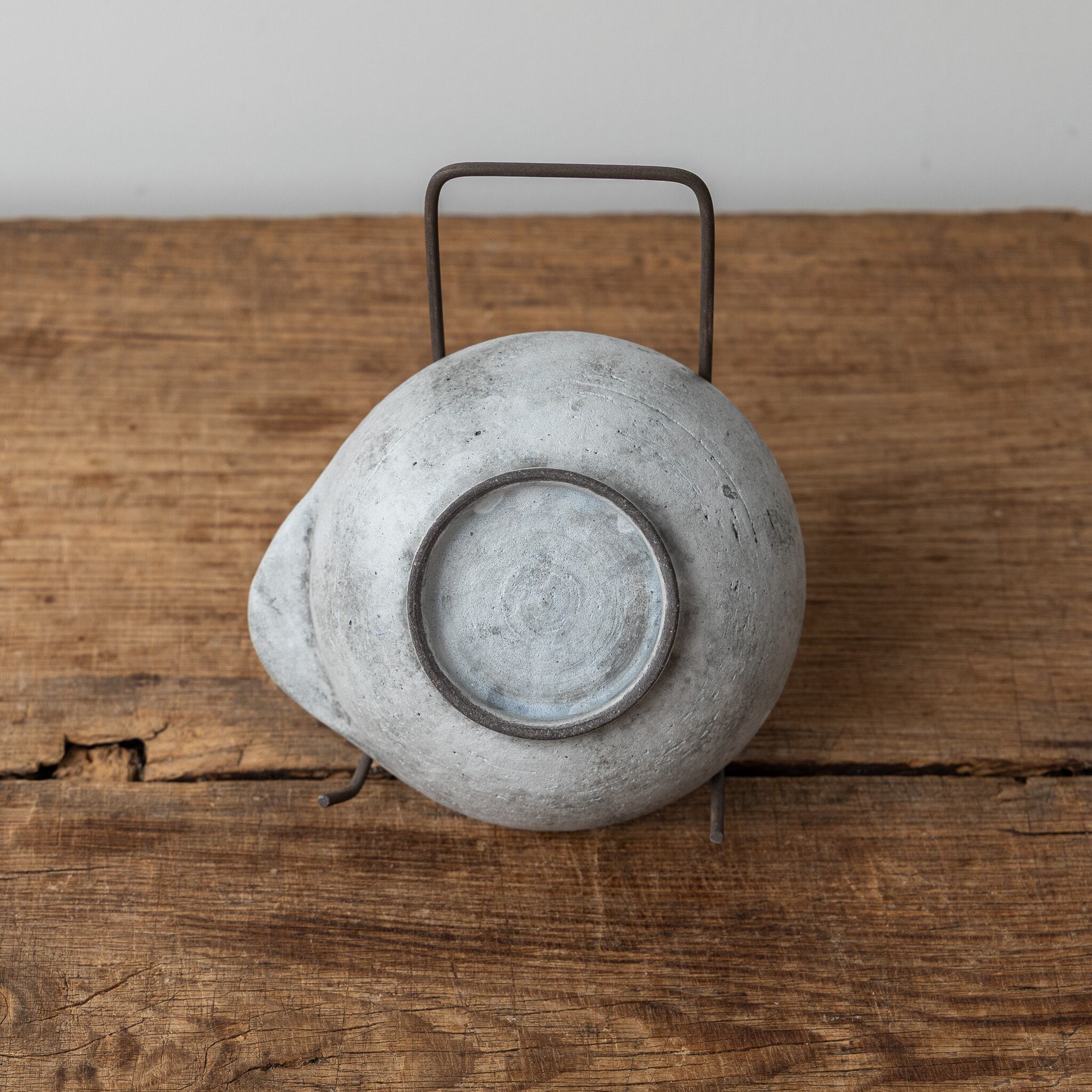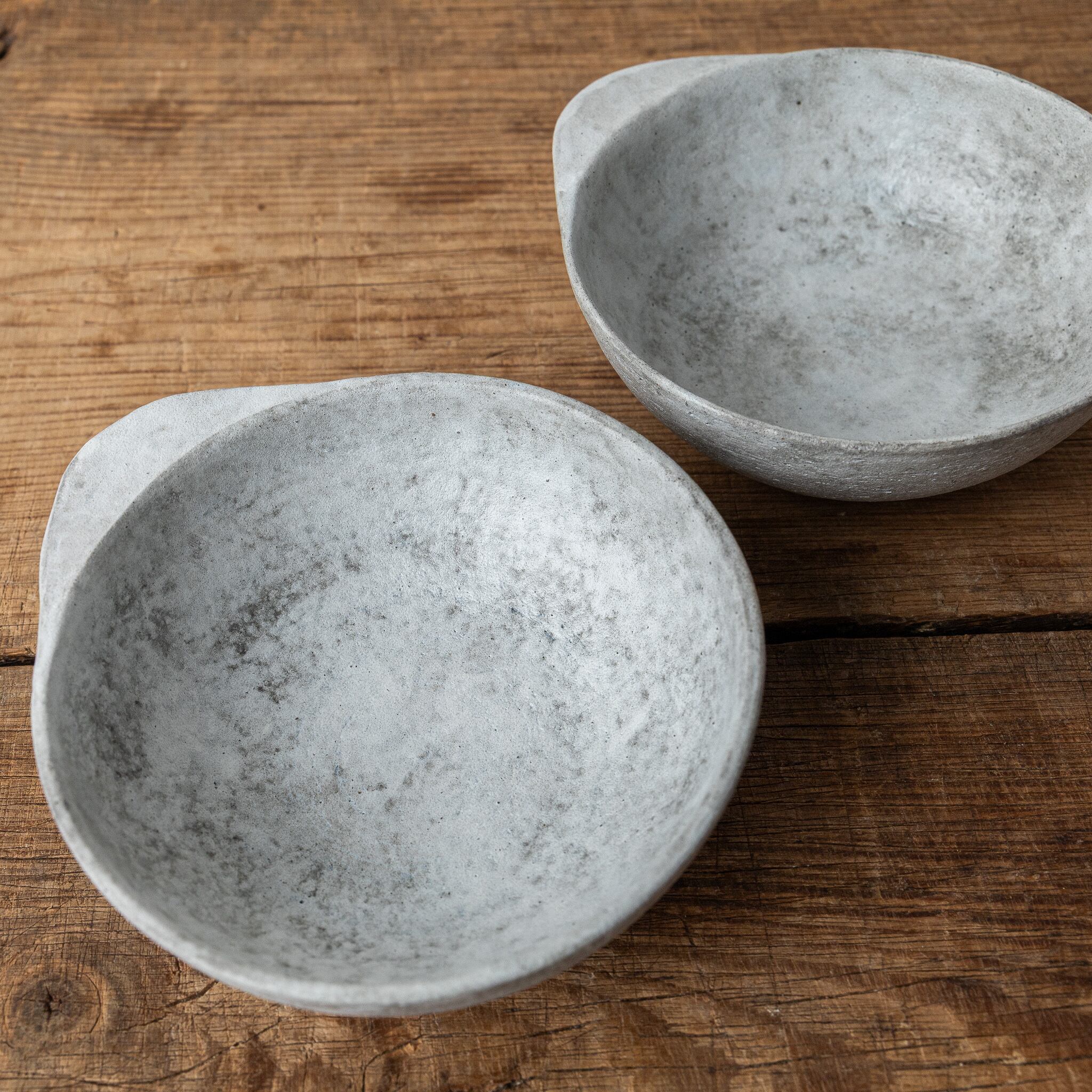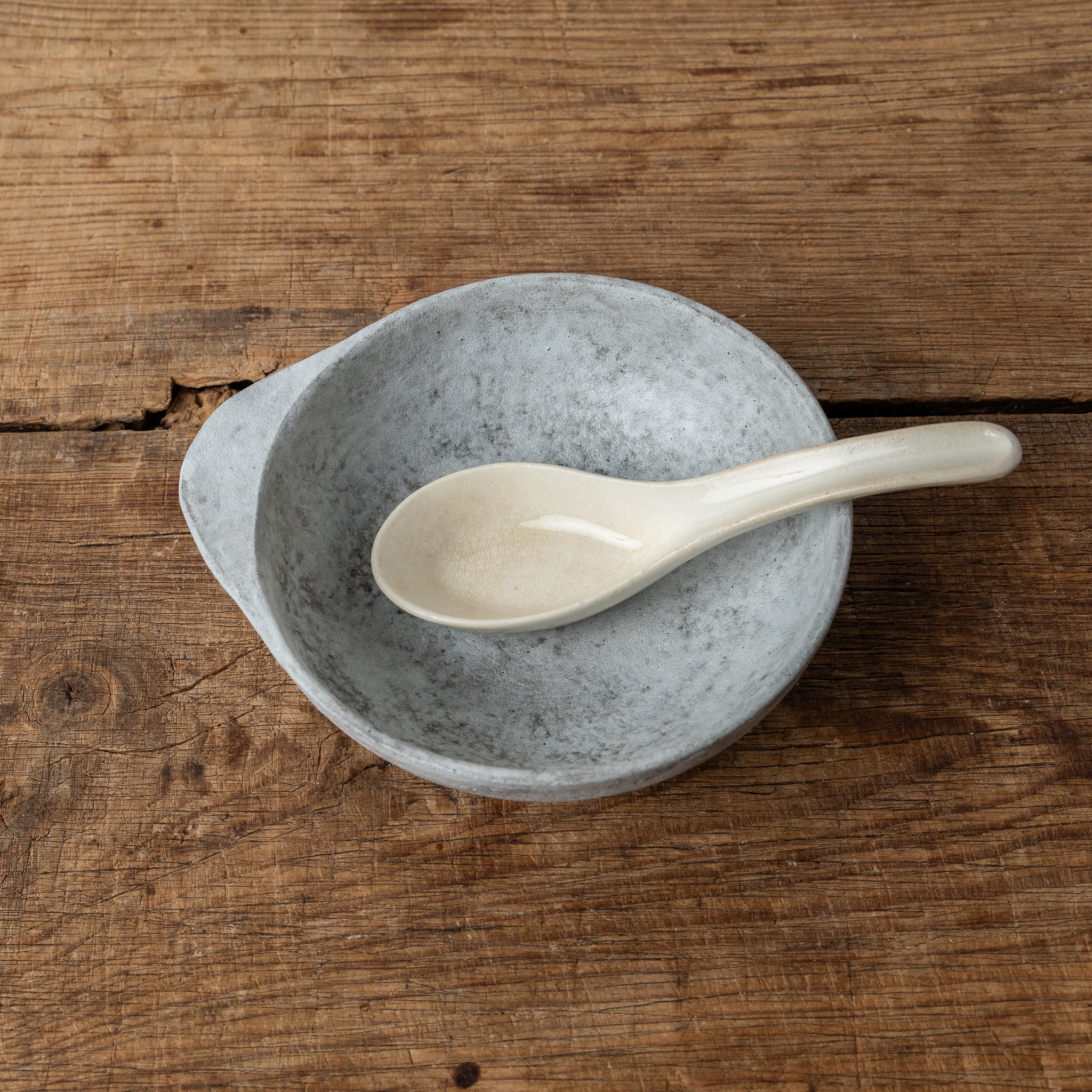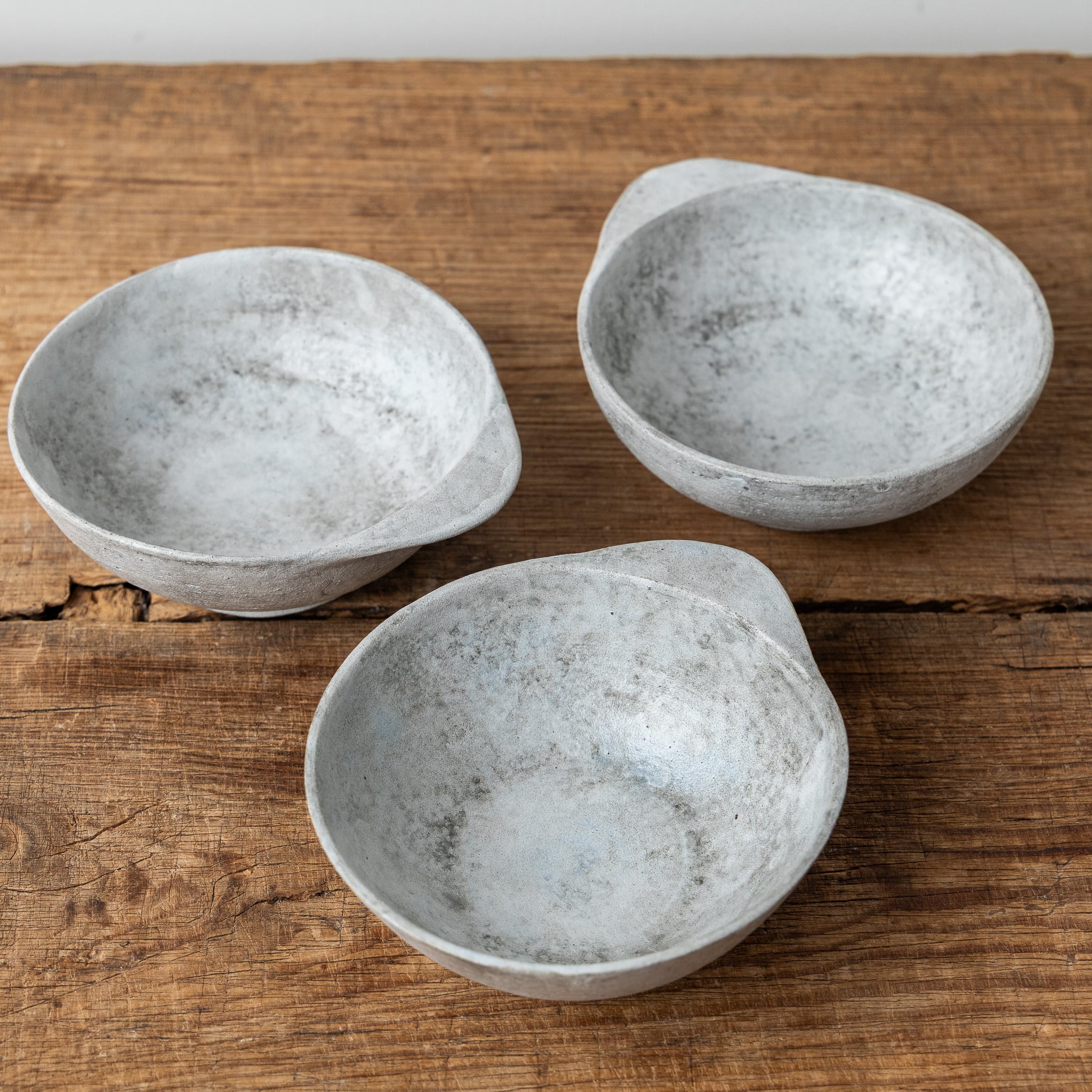 黒土に薄く灰釉を施し、さらに青と白の釉薬を手作業で重ねています。独自のテクスチャーとともに、発掘された器のような独特の風合いを表現しました。シンプルながらも存在感のあるデザインが、お料理を引き立てます。