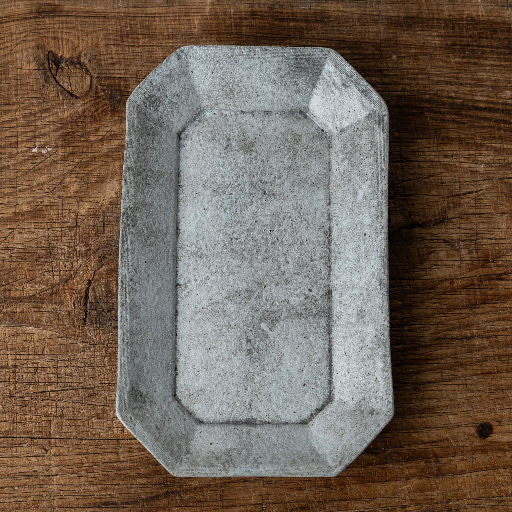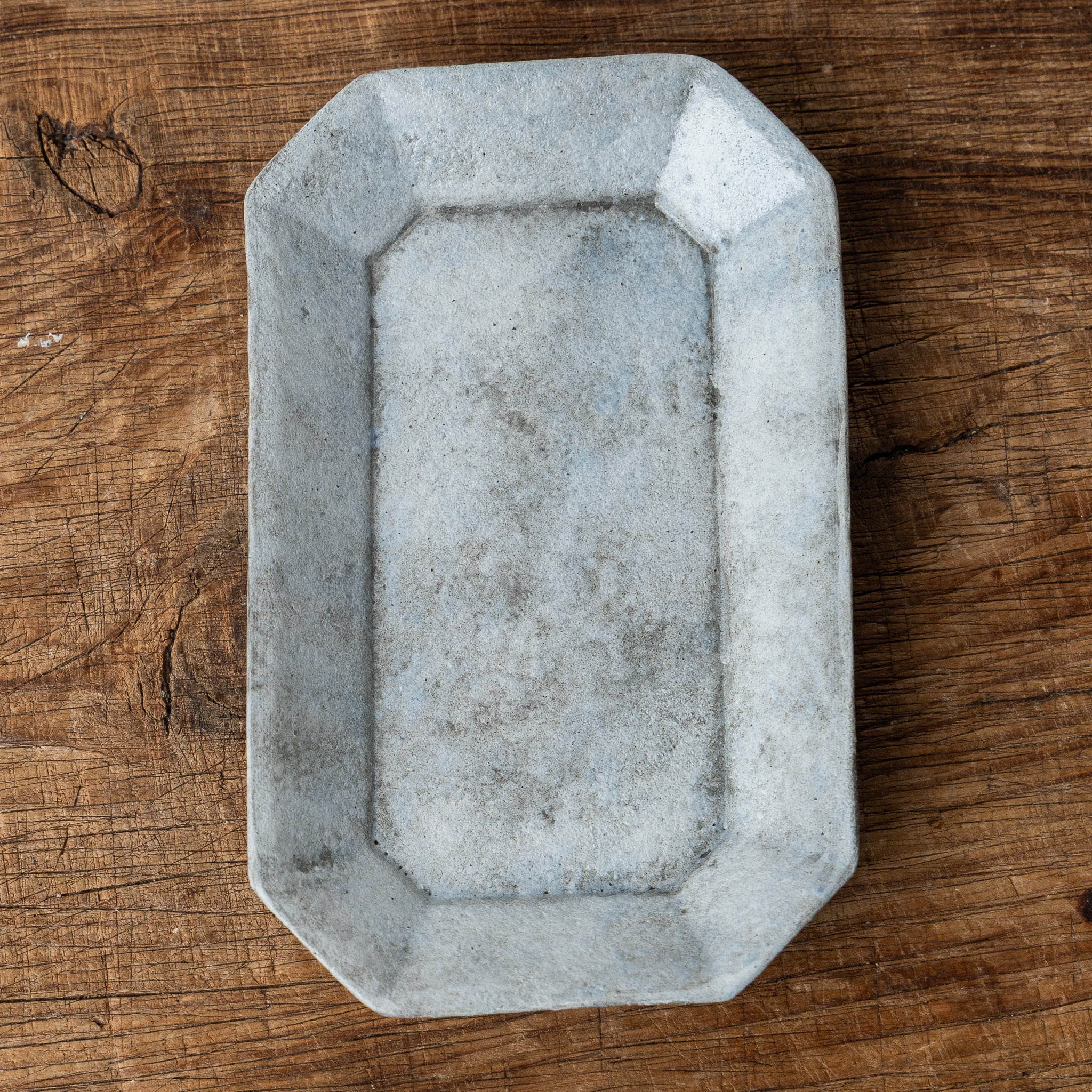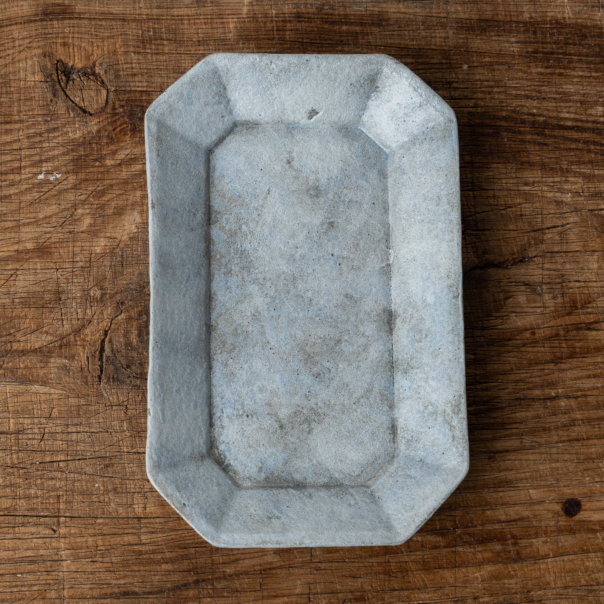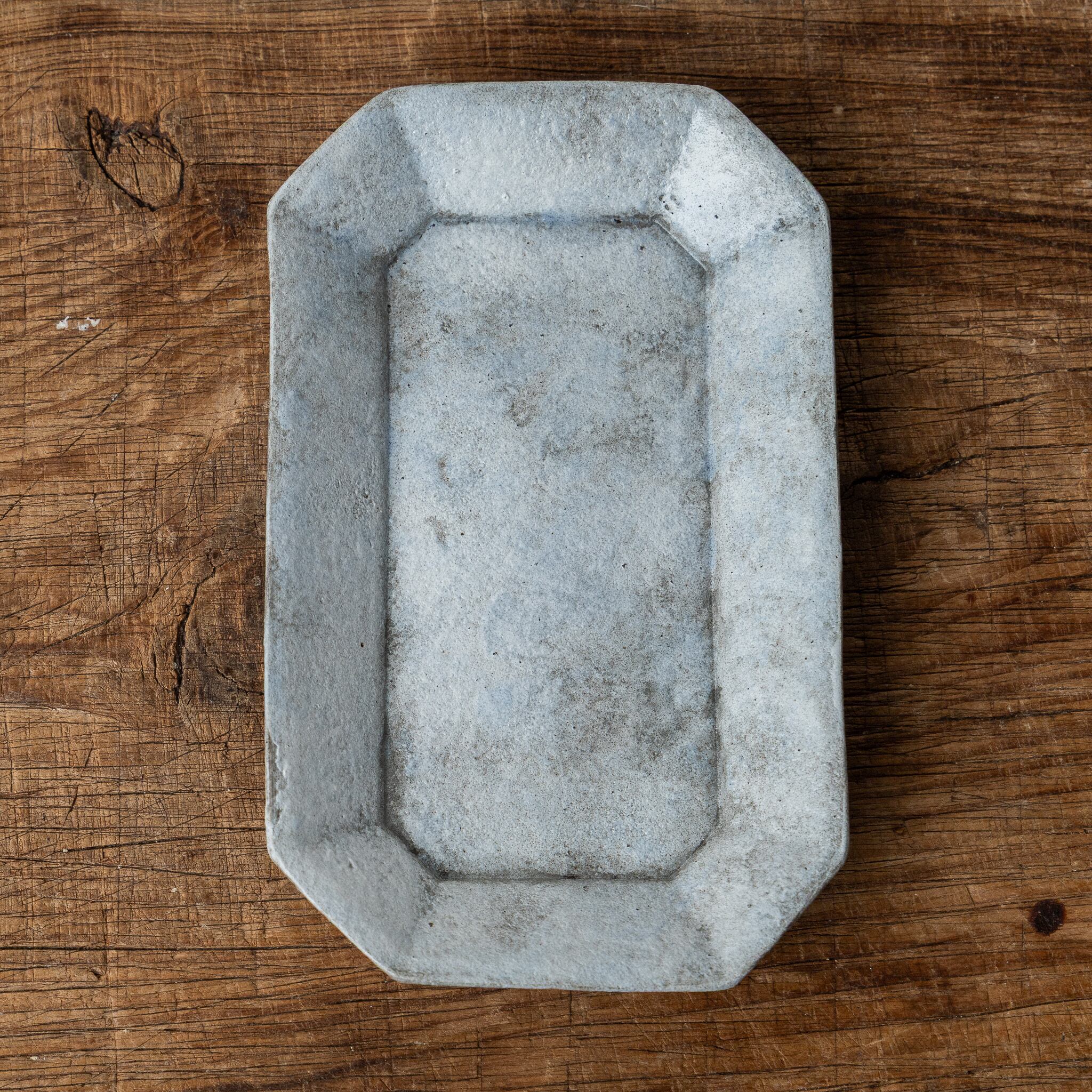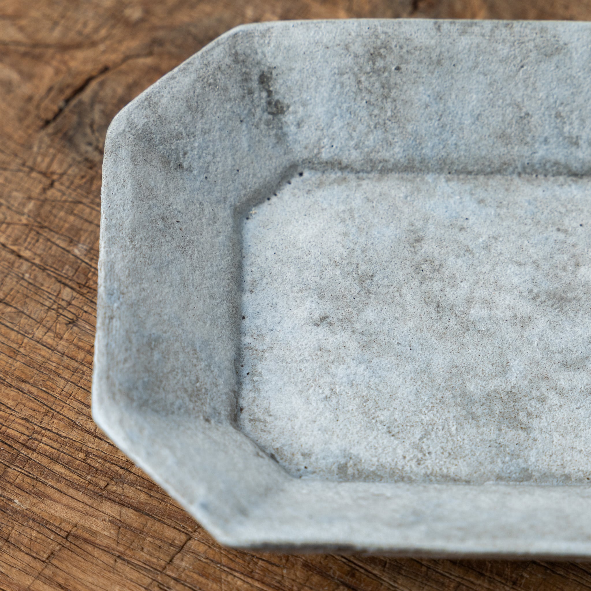 黒土に薄く灰釉を施し、さらに青と白の釉薬を手塗りで重ねています。独自のテクスチャーとともに、発掘された器のような独特の風合いを表現しました。シンプルながらも存在感のあるデザインが、お料理を引き立てます。